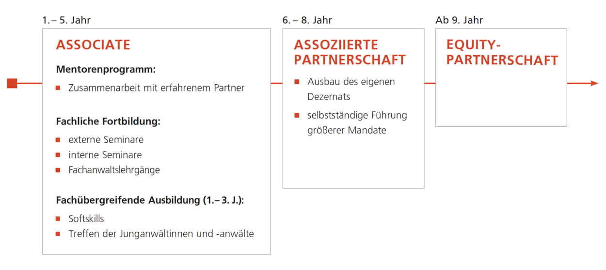Sie starten als Associate mit zwei Partnern als Mentoren. Nach fünf Jahren folgt die Entscheidung zur Assoziierten Partnerschaft. Nach weiteren drei Jahren erfolgt die Entscheidung zur Equity Partnerschaft. Dies ist bereits in Ihrem Arbeitsvertrag festgelegt.